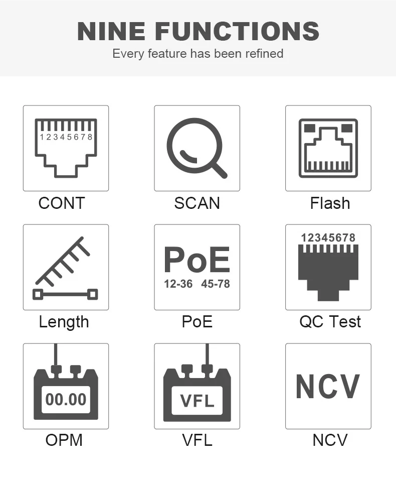 1. Multi-Function Network Cable Tester 1) PoE testing : identify which pins are providing power and detect how much voltage, identify which the type of PSE (at/af standard) 2) Measure cable length accurately , the range is 200m. 3) Two scan modes selectable: AC filter & Non AC filter 4) Test physical status for STP, UTP lan cable. 5) Hub blink for locating network port by the flashing port light on Hub / Switch.